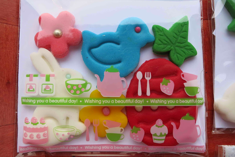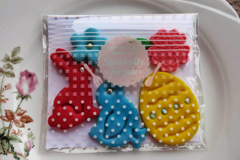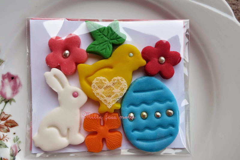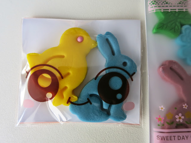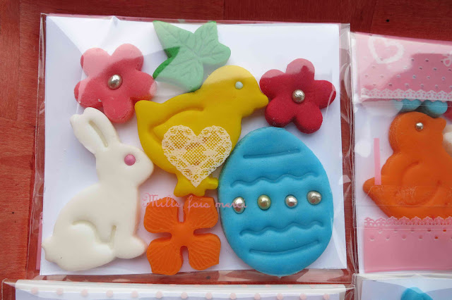 - 3 lei / pachet mare; Fiecare pachetel contine aproximativ urmatoarele produse: un ou de Paste, un iepuras, un puisor, 2 floricele si o frunza. Dimensiunea aproximativa a unui astfel de pachet: 10 cm latime, 8,5 cm inaltime.